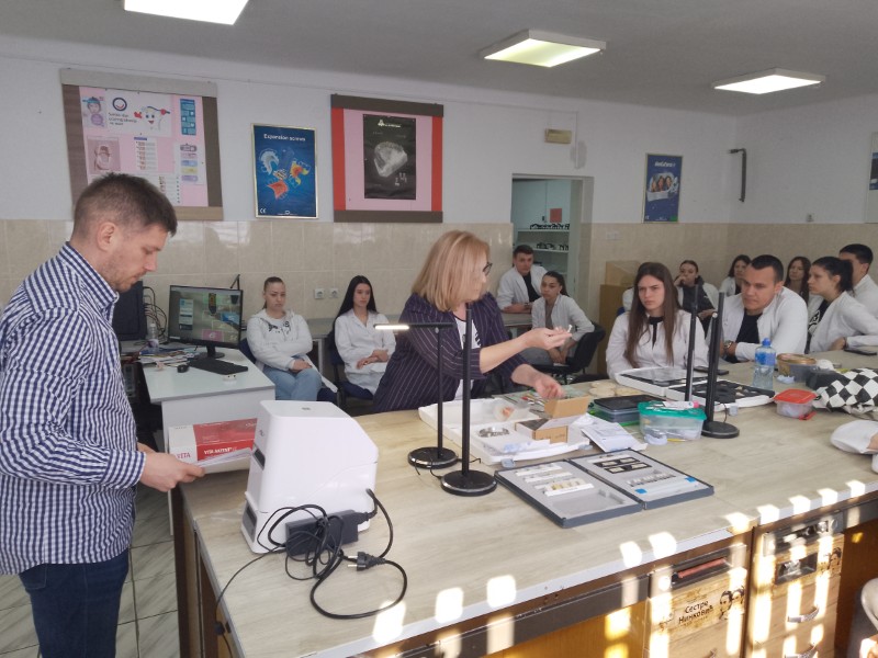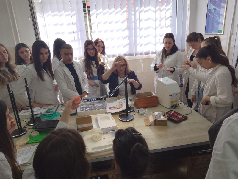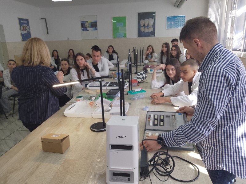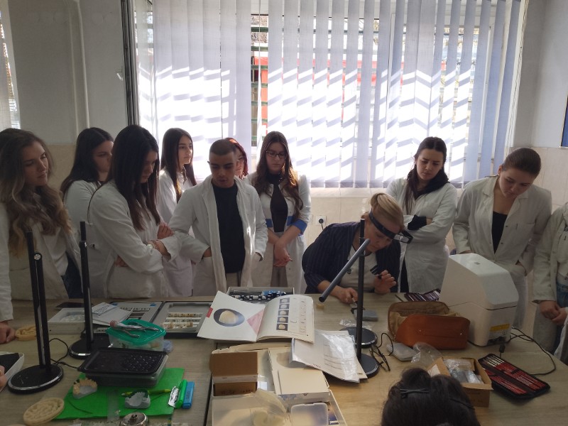 Ученицима четвртог разреда образовног профила зубни техничар Мирјана Загоричник одржала је предавање, тема – ДИГИТАЛНЕ МЕТОДЕ РАДА & VITA AKZENT LC светлоснополимеризујући композитним систем ефекти и њихова својства (за бојење и глазирање на бази метакрилата за екстраоралну репродукцију индивидуалних ефеката бојења, за карактеризацију) и демонстрирала њихову примену након чега су ученици самостално применили стечено знање на радним моделима.
